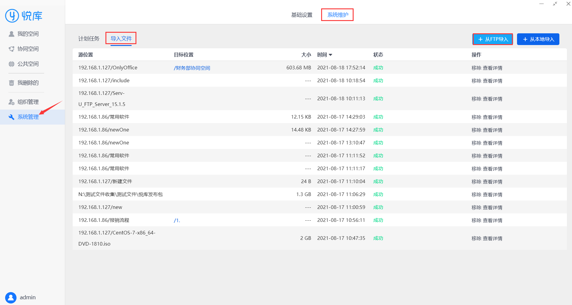 部分企业现用FTP存储文件,想要将FTP中的文件导入到服务器中,可以选择从FTP服务器中导入文件到悦库服务器,可使用此方法,系统管理-系统维护-导入文件,点击从FTP导入。